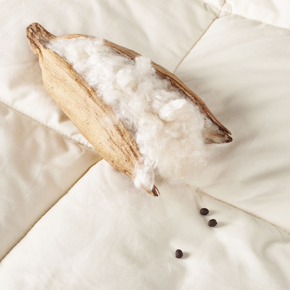 Kapok er en let og luftig naturfiber, der høstes fra kapoktræer i tropiske regnskove. KIRUNA puden er et vegansk alternativ til dunpuder og den føles ligeså blød som at sove på en dunpude. På grund af dens unikke fiberstruktur, har kapok fremragende isolerende, temperaturregulerende og antibakterielle egenskaber.