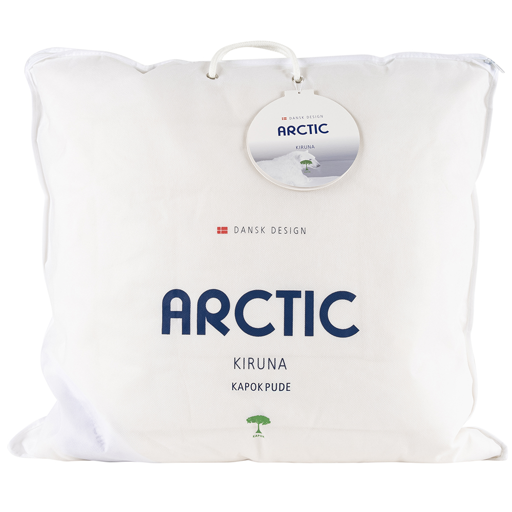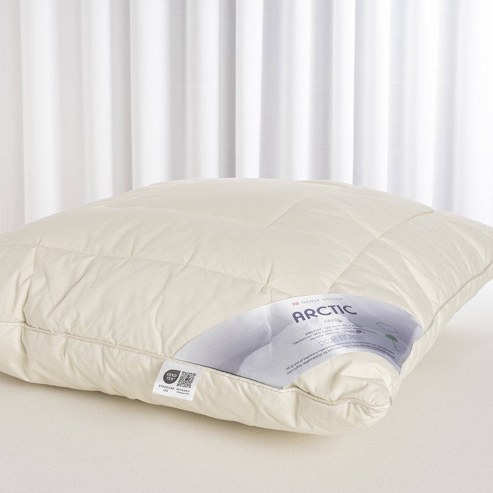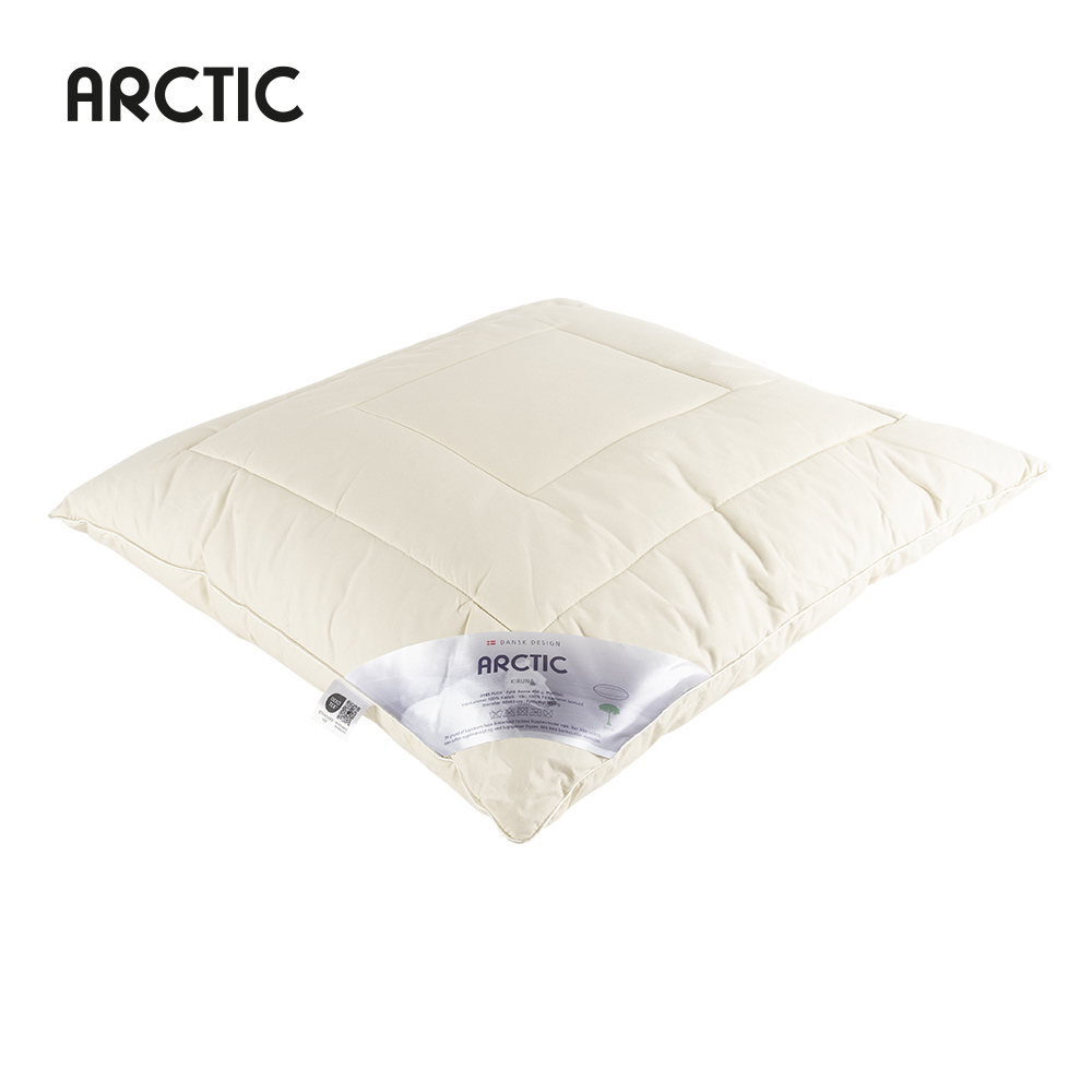 Kapokpuden Kiruna fra ARCTIC er en 3-kammer pude med hulfiber i kernen og kapok i yderkamrene, og betrukket med et blødt og quiltet bomuldsvår.