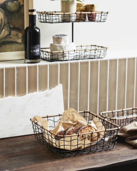 HANA opbevaringskurv er lavet i sort metalflet med en fin bambus kant. Et let og minimalistisk udtryk, hvor det multifunktionelle design giver et utal af muligheder for praktisk opbevaring i indretningen. Opbevaringskurven er med to hylder, kombineret med et funktionel håndtag på toppen. Et simpel design, der kan anvendes i mange forskellige rum. Opbevaringskurven findes i flere varianter og størrelser.