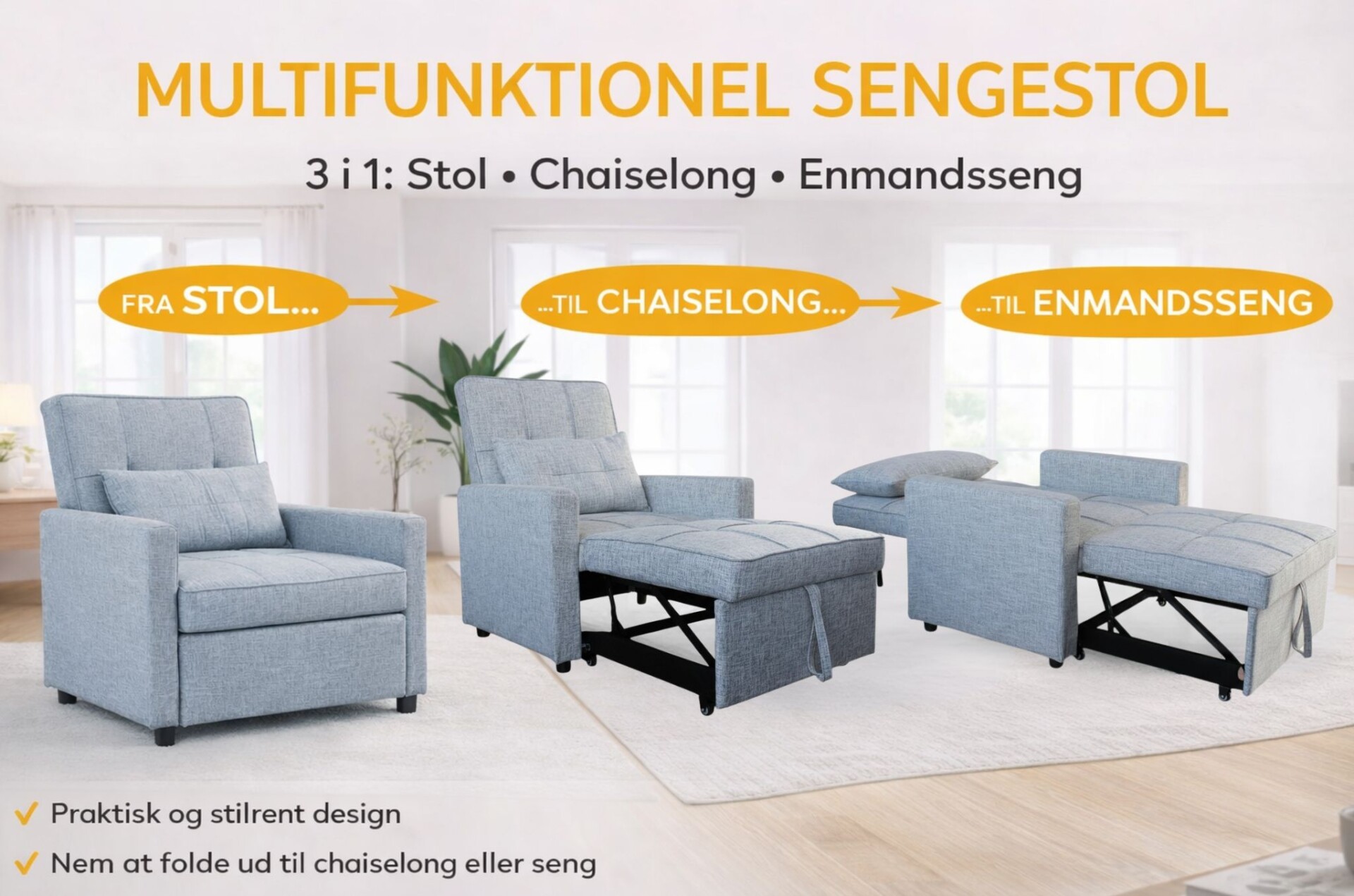 En behagelig lænestol, der nemt konverteres til chaiselong og sovesofa.