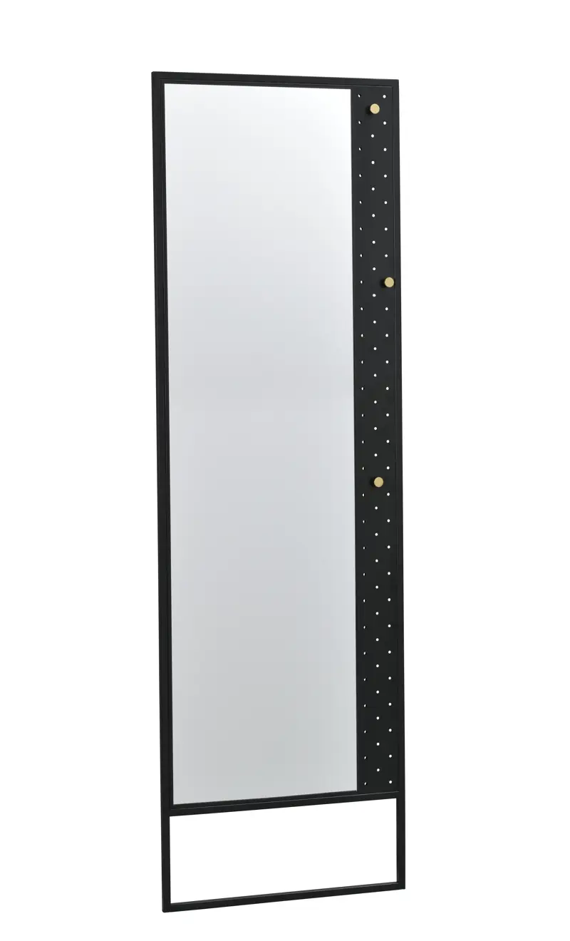 Malone gulvspejl i målene 53×170 cm i sort metal. Malone Hall-serien består af pulverlakeret metal med en sandfarvet struktur og har metalknapper i guldfarve. Gulvspejlet har tre ophæng, der kan placeres efter dine ønsker.