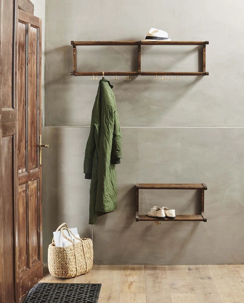 Flot og praktisk træhylde med 10 messingforgyldte knager, der er aftagelige. En smuk hylde i et enkelt og flot design, der også er perfekt som skohylde i entreen. Dybden er 31 cm. Match evt.med spejlene ARDEA i samme kvalitet.