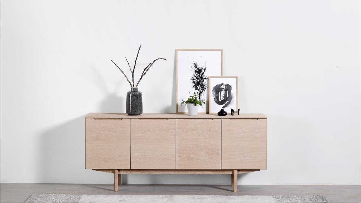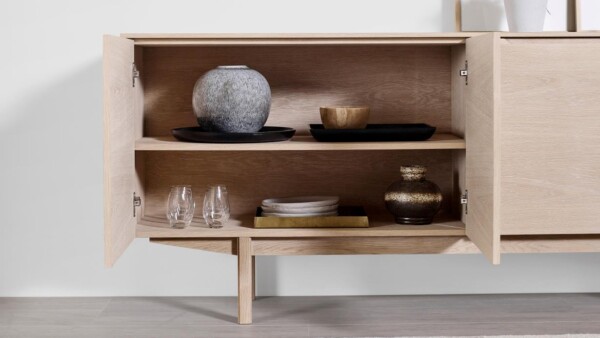 Skænk #306 har en enkel og klassisk konstruktion, der passer til en stilfuld indretning. Skænken består af to rummelige skuffer og to hylder bag to døre. De tp andre døre gemmer på et dobbeltskab med bred hylde, så der er plads til de store fade og skåle.