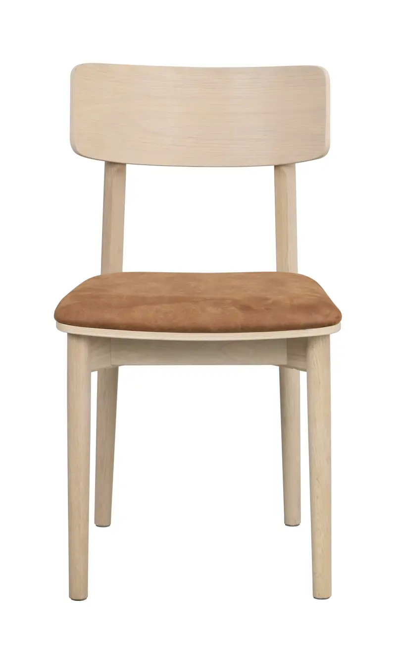 Wolcott-stolen i hvidkalket eg med et sæde af brunt lædertekstil har et moderne design, hvor lige linjer møder bløde, afrundede former og skaber en harmonisk balance. Stolens naturlige træfornemmelse bringer en varm, indbydende og lys atmosfære i hjemmet. Wolcott er FSC®-certificeret, og sædet er betrukket med en blanding af genbrugslæder og tekstil, hvilket bidrager til et mere bæredygtigt og miljøvenligt interiør. Fås også i naturlig eg.